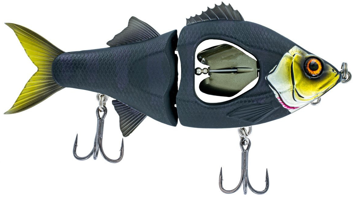 The Chasebaits PropDuster Glider is an innovative, new glidebait-style hard body swimbait with a propellor blade similar to the kind you would find on a buzzbait in the center of its body. Not only does this buzz blade make the bait look alive, it generates tons of water vibration and provides a distinct contrast and flash. Upon retrieve, the lure's single joint construction produces a 180-degree side-to-side glide bait swimming action that consistently draws savage reaction strikes from predators.