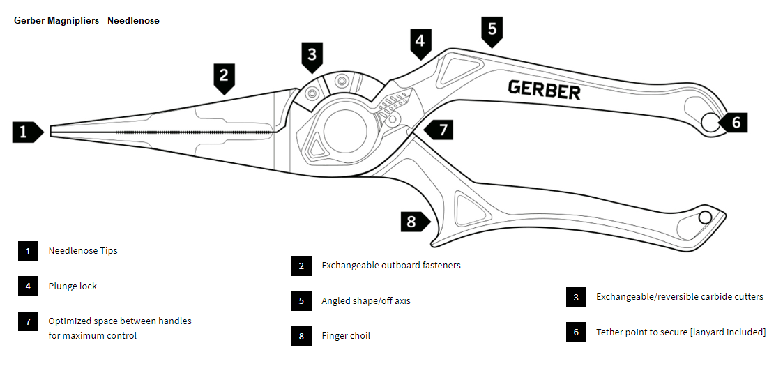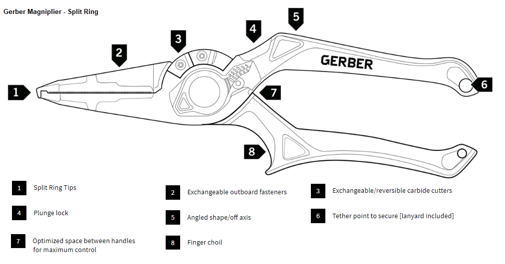 Get a grip on the unexpected. Swift power is on hand with the durable, hot-forged Gerber Magniplier Pliers. The ergonomic trigger grip is offset to keep line of sight in tight places, while the finger choil offers maximum control. The thumb lock and ambidextrous tether points ensure safe stowage and transport while on the move. Engineered to meet the needs of the saltwater fisherman, SALT Rx™ offers superior protection against corrosion, wear, and tough environments. The durable, hot-forged Needle Nose Magniplier provides extended reach and line of sight to remove hooks from the belly. The Split Ring version efficiently handles Size 2-10 Split Rings for quick rigging. Choose the right Magniplier for the job.As far as fishing gear goes, pliers aren't new to the scene. The tool itself isn't groundbreaking and it wouldn't be a stretch to think that fishing pliers had peaked. Gerber looked at the tool with fresh eyes and realized that the greatest opportunity lied in the ergonomics - power and control could be optimized with simple adjustments to the design of the fishing pliers.With Gerber's Bearhand Control, the Magniplier positively engages with your hand for a solid, confident grip. Bearhand Control is an ergonomic control system comprised of three design elements that translate the power of the hand into power you can utilize in the tool. First, the space between the handles is purposeful - it is optimized to engage where the hand is strongest for maximum force. Second, an oversized finger choil is integrated as another place to rest the forefinger providing added stability. Last, the nose of pliers is off axis for improved line of sight and control when removing the hook from a fish's mouth.The Gerber Magnipliers are a hot-forged aluminum construction, allowing the metal to be manipulated into the ergonomic design as well as give the pliers unrivaled strength. The spring-loaded pliers lessen hand fatigue and are held in check by a plunge lock - meaning the tool won't open unexpectedly when you're on the move or catching fish. The nylon sheath includes a belt loop, d-ring, and coiled plier lanyard and can be tethered from multiple points.The Gerber Magniplier's jaw tips are purposely biased open. There is a tolerance range for the gap, ensuring that the cutters will close completely and function as intended when gripping an object. The maximum end of the tolerance range allows the user to close the tips completely by squeezing slightly harder after the cutters have made contact with one another. Even the smallest hooks are able to be de-barbed and manipulated, despite the designed-in air gap at the tips.It doesn't matter if you are hiking in, wading in a river, or bobbing in a kayak, the Magniplier is built for the adventure. If you're looking for innovative fly fishing pliers, kayak fishing pliers, or bass fishing pliers, look no further. The Gerber Magniplier Pliers is the only set you'll need.Gerber tools are built to last a lifetime. Even though the Magniplier is Salt Rx™ optimized to withstand hard saltwater environments w/ added corrosion resistance, to ensure optimal performance, rinse your tool with fresh water and dry thoroughly with a clean towel. Apply oil to hinges and moving parts on a regular basis.