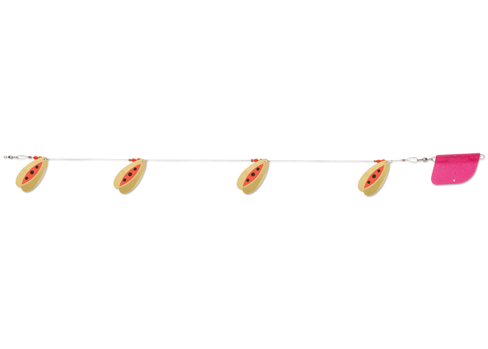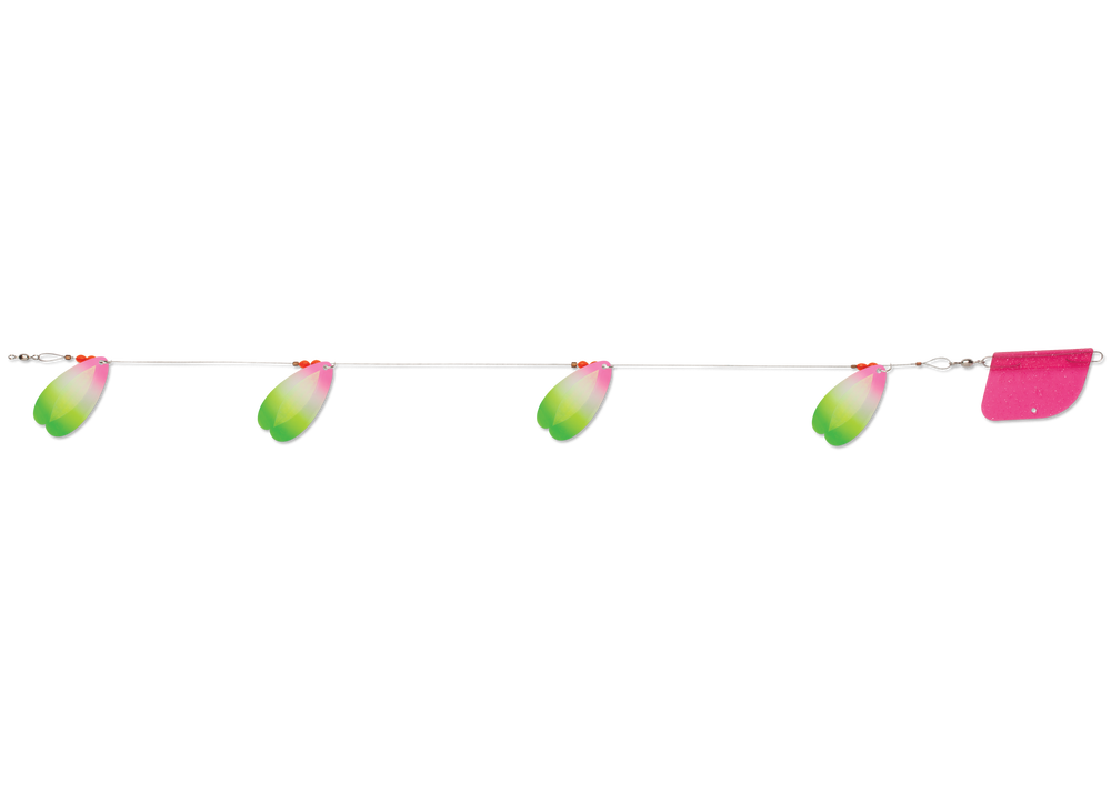 The Luhr-Jensen Bolo Flex-i-Troll is a lake trolling rig featuring Luhr-Jensen's unique Bolo blade design. With shape that essentially looks like two overlapping French blades, the Bolo design spins in wide circles, offering brilliant flash and vibration, even at slower trolling speeds. Multiple sizes allow the Bolo Troll to suit waters from smaller ponds to large reservoirs. A built-in trolling rudder eliminates spin and annoying line twisting.