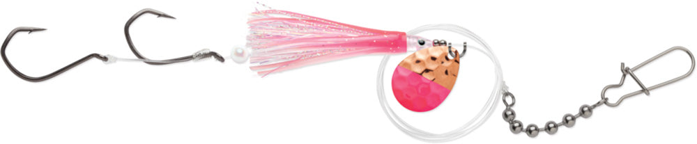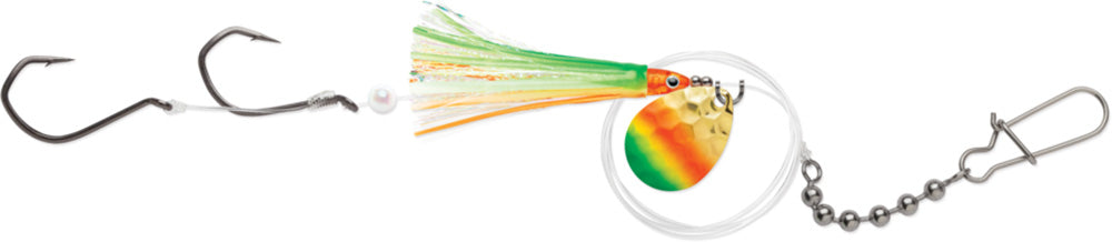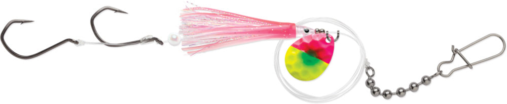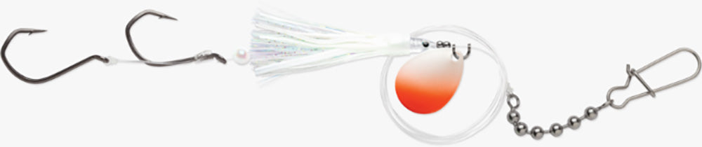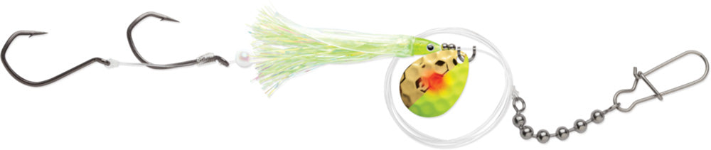 It comes equipped with two VMC Techset hooks on a 30-inch, 40 lb Sufix Fluorocarbon leader, designed to securely lock fish in place. For optimal results, it's recommended to use the Spin 3.5 Flash behind Dipsy Divers or Coyote Flashers.