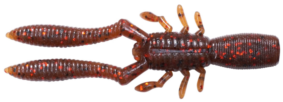 The Megabass Bottle Shrimp is a 4 inch hog-type worm creature bait that imitates freshwater prawns and crayfish, one of the main types of bait used around the world. When used for Texas rigs and jig trailers, the large power arms move dangerously, mimicking the defensive actions of crayfish. With bottom contact, the inertia of the weighted arms will cause a shivering action that starts at the tips of the arms and runs to the base, triggering bites.