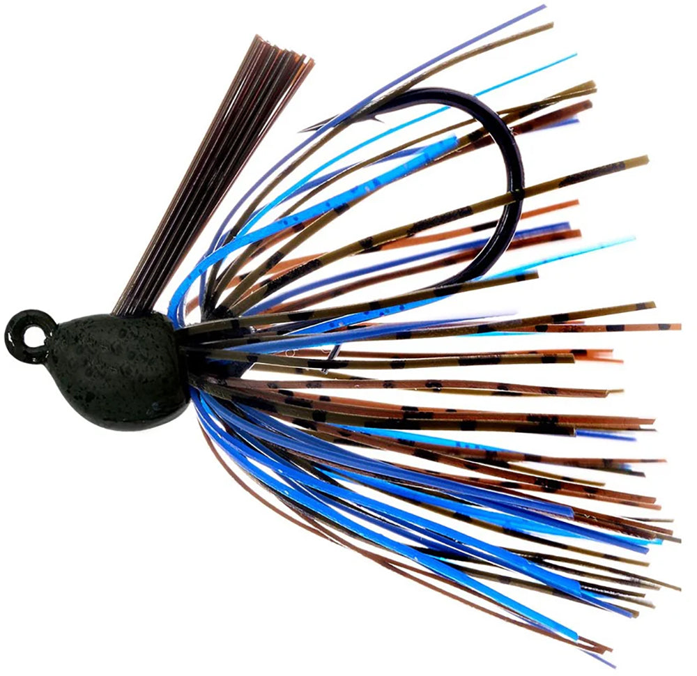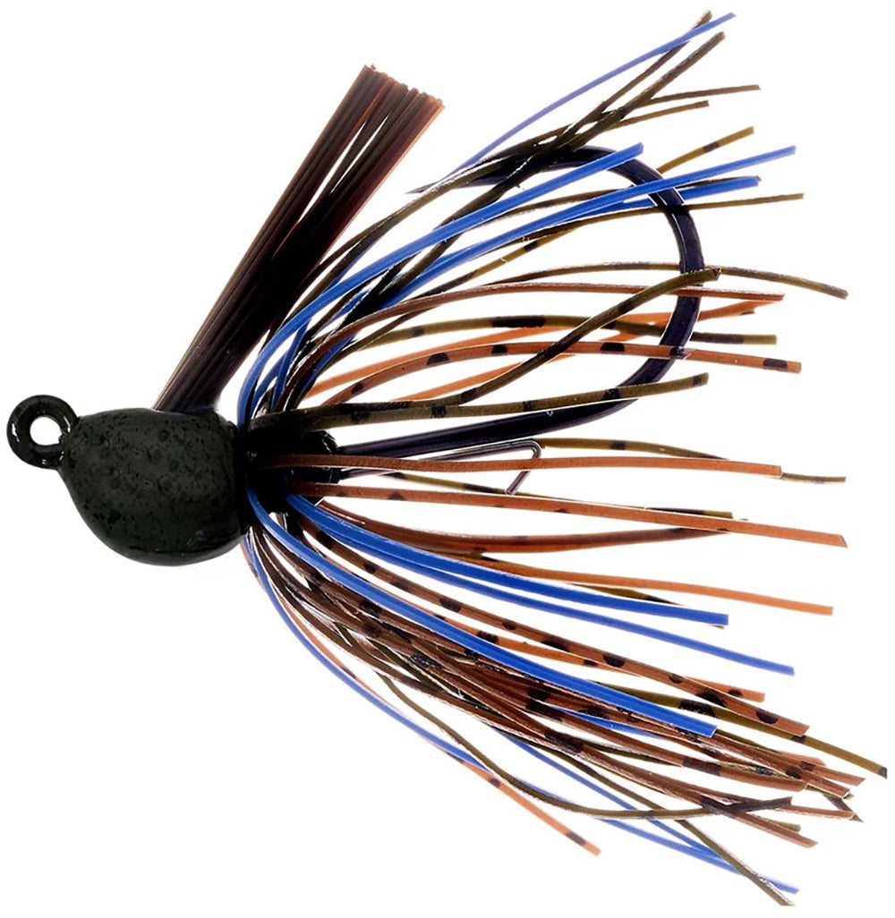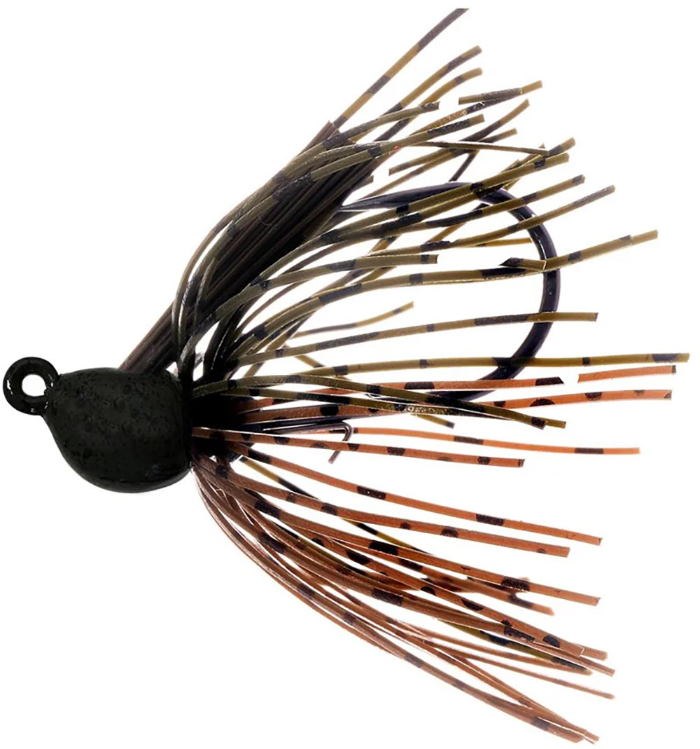 Its high-quality lead head, featuring lifelike 3D eyes and hand-tied silicone skirts in a variety of captivating colors, creates an irresistible target for fish. The jig's slim head design allows it to efficiently navigate through light vegetation, delivering soft plastics to hidden predators!